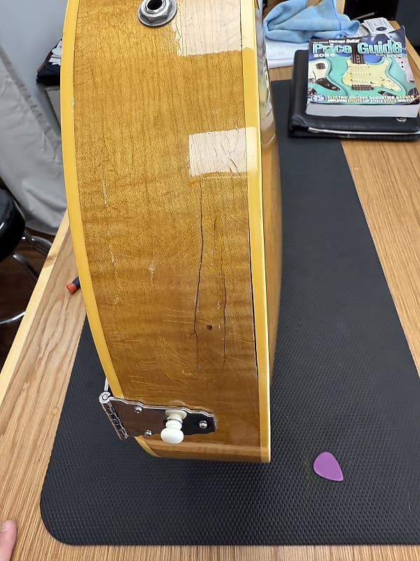 1948 Gibson ES-350 in original blonde/natural finish. A very pretty example with some figuring on the back/sides and the factory stinger. This guitar is all original except the pickguard and the frets, but it has had some extensive repair work. The side panel near the input jack was once replaced and the sides oversprayed. After this repair the guitar cracked again in the same area and this was repaired again. The back has light overspray in the belt buckle rash area. And for some reason part of the f hole under the pickguard was broken or cut off. The neck and top have all original finish. Please see all photos. Good news is that besides the repairs this is a great playing/sounding ES. Comes with the original brown case.