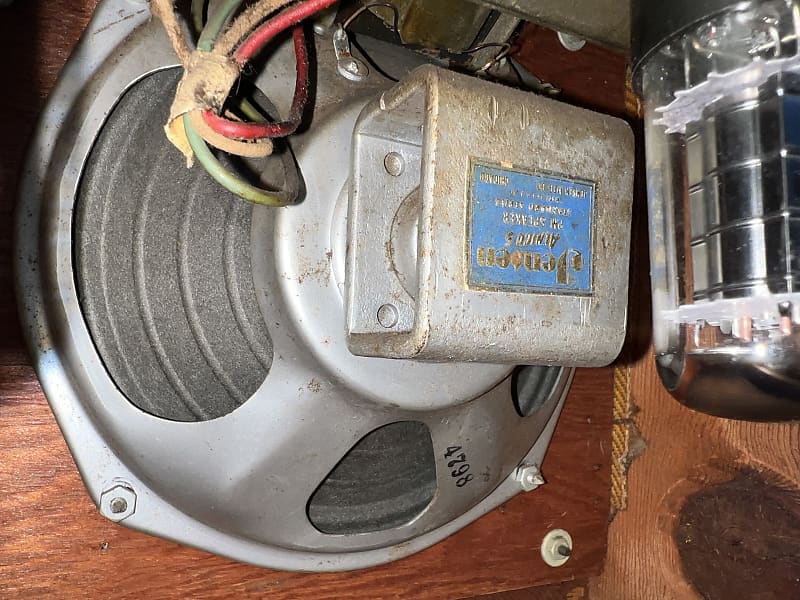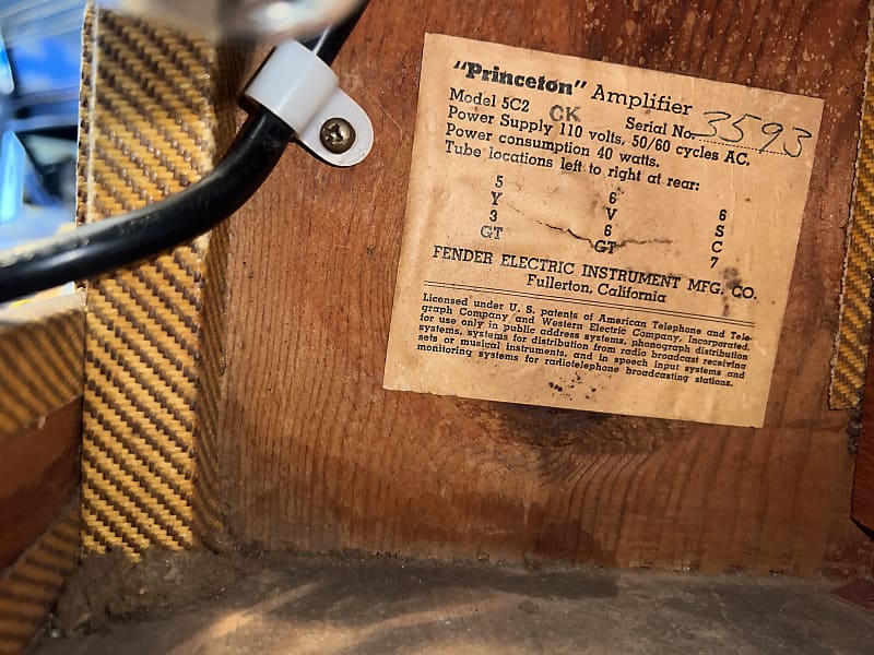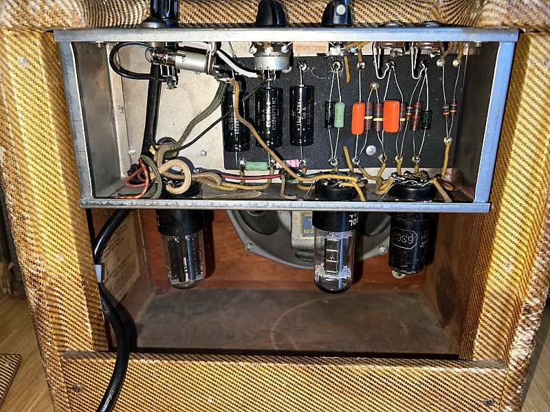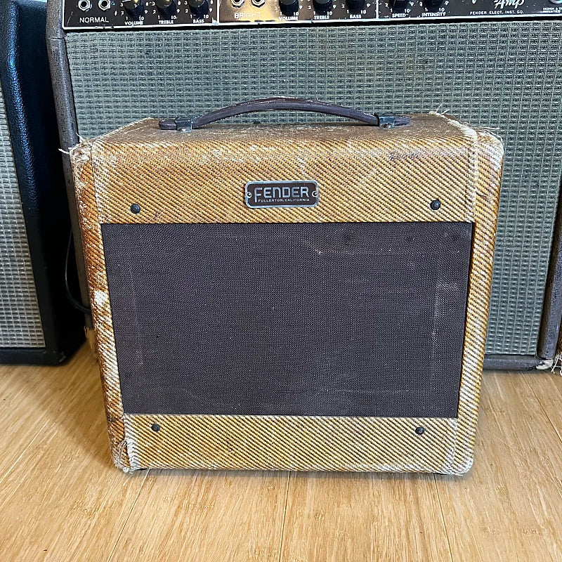 1953 Fender Princeton. Basically a champ with a tone control, whats not to love? All the important parts are original: tweed, speaker, transformers. Its had a typical cap job, three prong chord and handle replaced. I have the original handle. No issues at, classic tweed breakup tone at manageable volumes.
