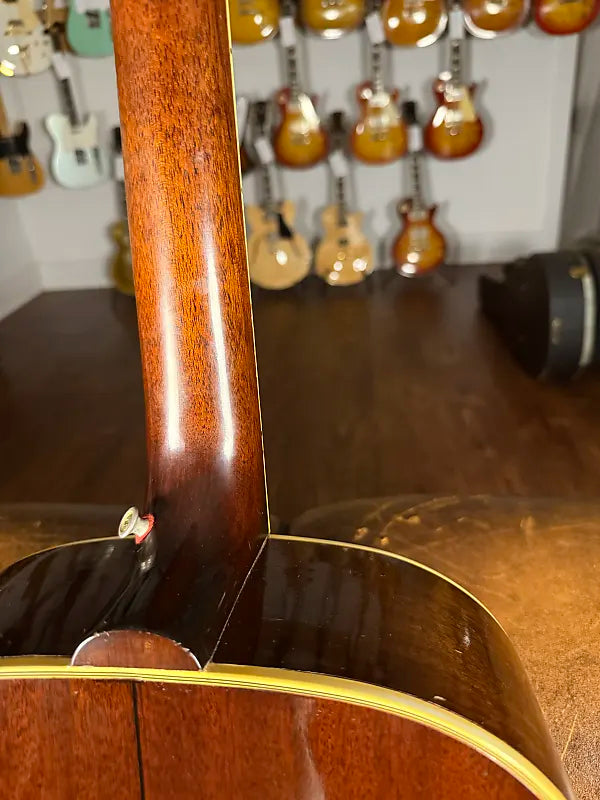 1953 Gibson Southern Jumbo in original sunburst finish. This guitar is exceptional in tone and condition. Best acoustic in the store right now. It is all original with exception to the strap button and a professional neck reset. Plays great after a recent pro neck set. Crack free except for a small pickguard crack. Some buckle rash on the back, but the finish is otherwise in excellent shape with no overspray. Comes in its original brown Lifton case that is fully functionally, but in a little rough shape.