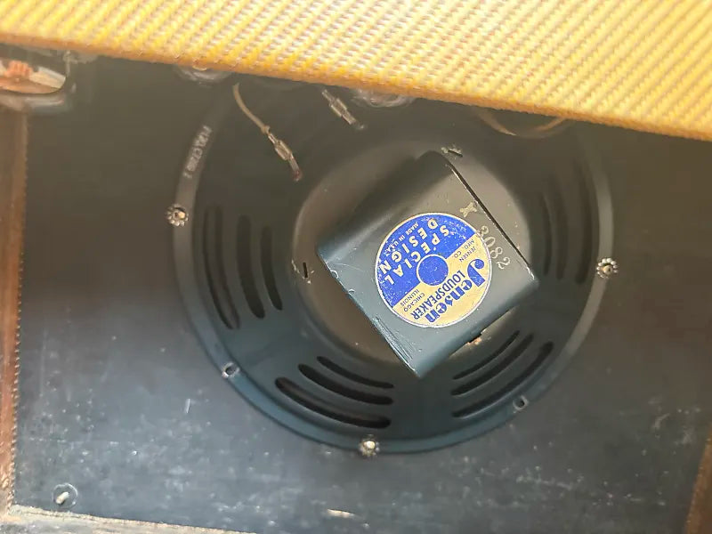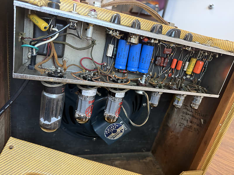 1955 Fender Tremolux. This one has been retweeded years ago, but retains all the other important original aspects (transformers and speaker). Has had professional maintenance and its working/sounding great. One of the more underrated of the tweed models, less boxy and a little more headroom compared to a more expensive Deluxe.