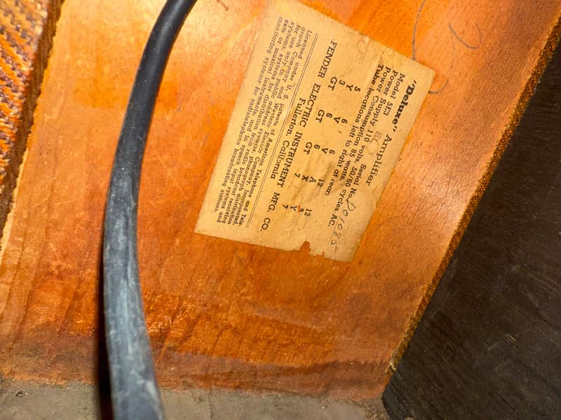 1956 Fender 5E3 Tweed Deluxe. This amp was obviously loved greatly and gigged hard. The cool part is all the important stuff is still original: tweed, transformers, speaker (dates to the end of 55). It has been professionally maintained (recap, new handle, 3 prong chord). This was done within the last year so this is ready to go. No issues. The upper back panel was modified and cut short for some reason.