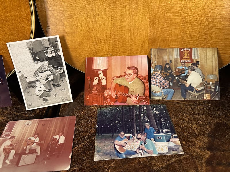 Straight from the original owners family comes this 1956 Martin D-28. The original owner was James Cook of upstate New York who owned both this and the 1957 Martin 000-18 (see other listing). His daughter Penny took to playing guitar and he eventually gifted this 000-18 to her. The two of them went on to play small gigs and family functions/barbecues together. Included are a dozen or so family photos and James and Penny playing the guitars. I bought both guitars together from Penny.