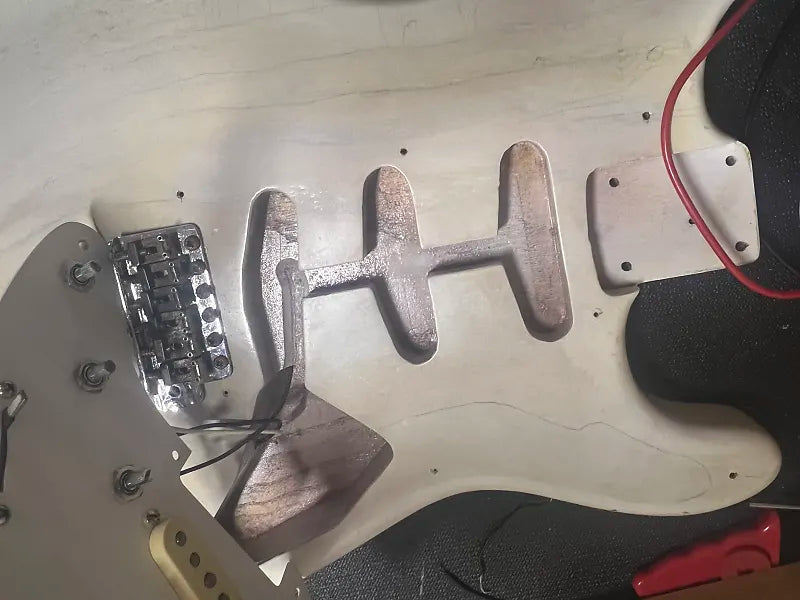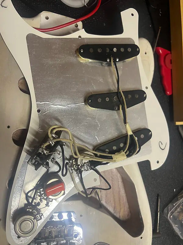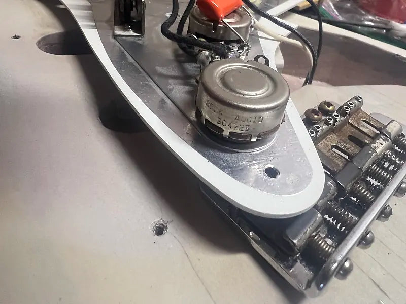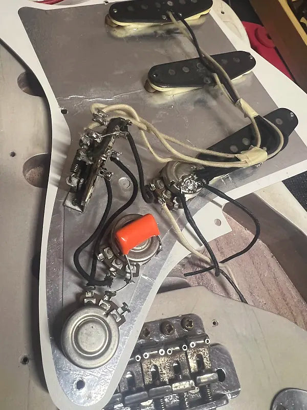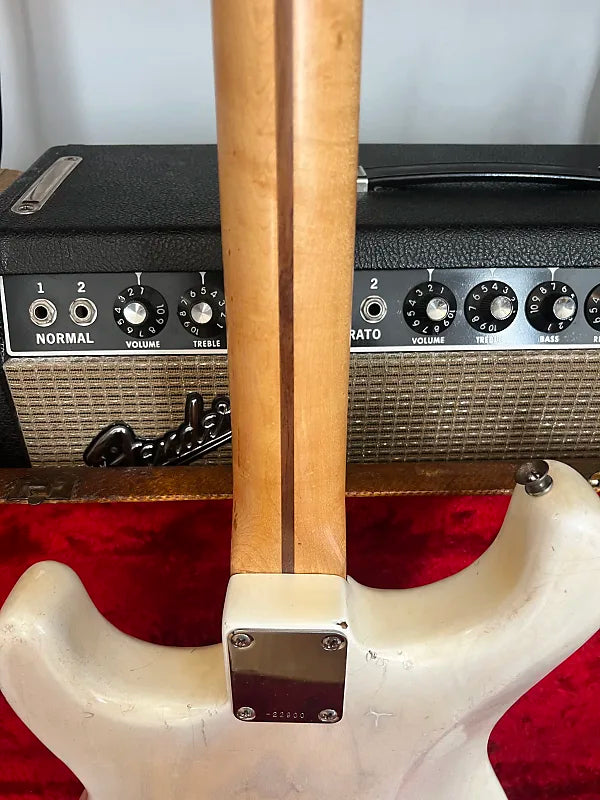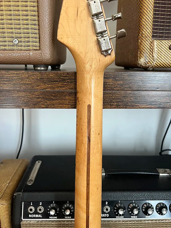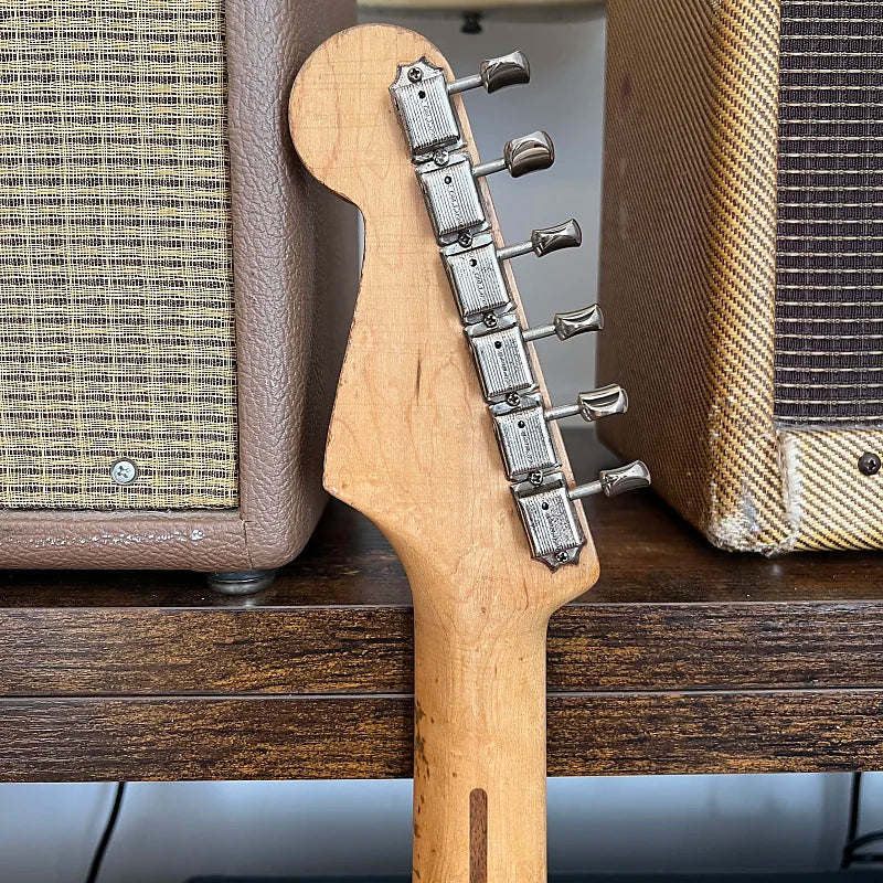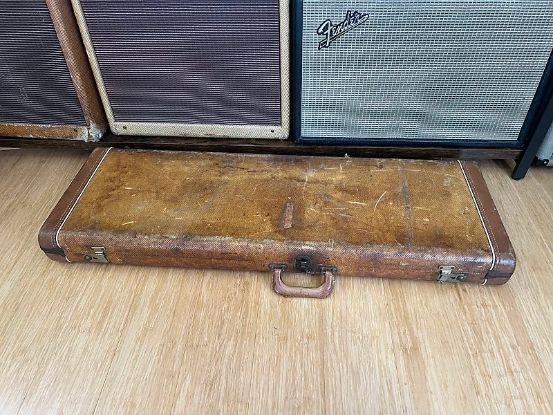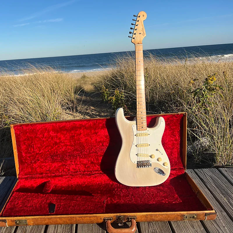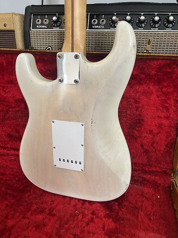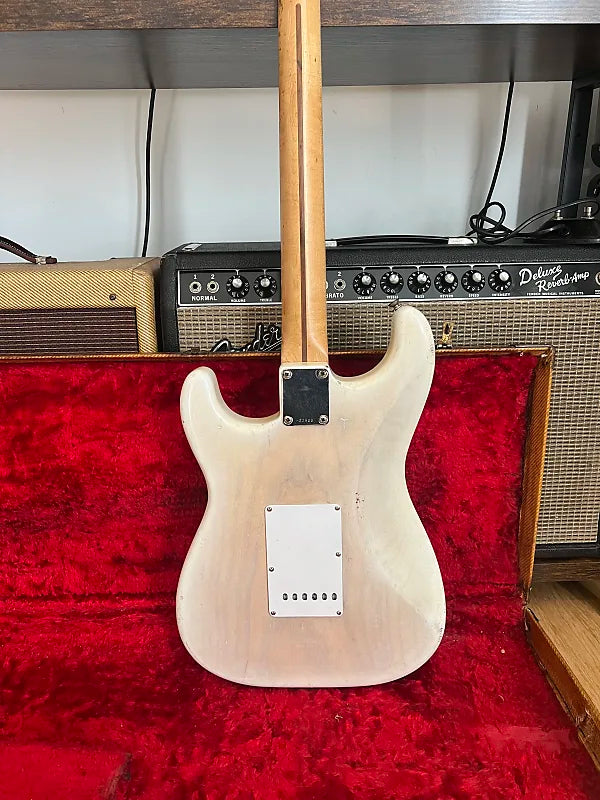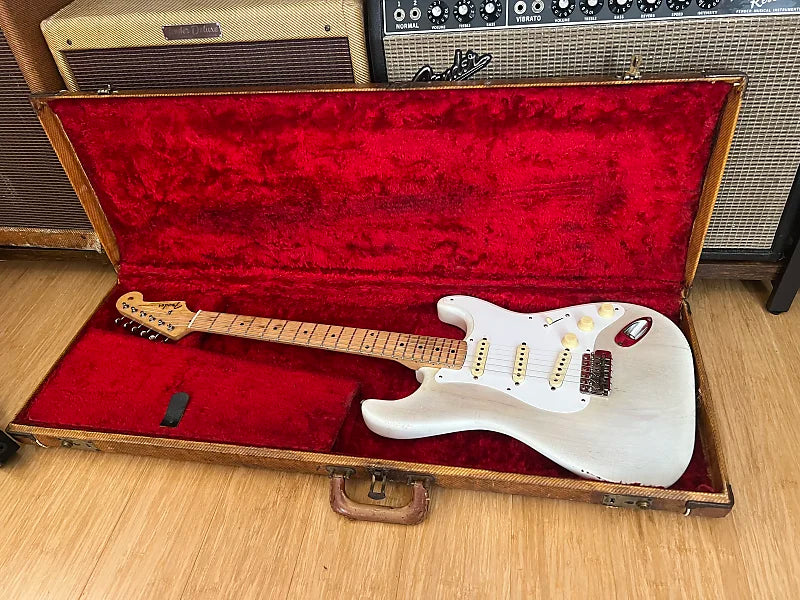 1957 Fender Stratocaster refinished in an aged Blonde. The guitar news about this guitar is it originally started life as a 1957 Blonde Stratocaster with a 1 piece Ash body (this combo was a big upcharge originally and a rarity). I got this guitar from the original owner who at some point brought it to a repair man that probably didn't know much about vintage guitars at the time. It sounds like the guitar had some kind of grounding issue and he replaced most of the wiring on the inside with newer cloth wiring (including the pickup leads). The good news is that all the components remain original: pickups (one rewound by Tom Brantley recently), pots, switch, and jack. The following pieces are also not original: pickguard, pickguard screws, capacitor, bridge mounting screws, backplate screws, 1 intonation screw/spring, all saddle height adjustment screws, and 1 jackplate screw. The backplate, covers/knobs/switchtip, bridge assembly (saddles, bridgeplate, block, claw, springs), neckplate/screws, and tuners/screws are original. It has also been refretted and the decal is likely replaced when it was refinished. Comes with its original tweed case in good shape. I do not have the tremolo arm.