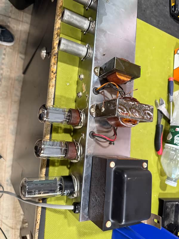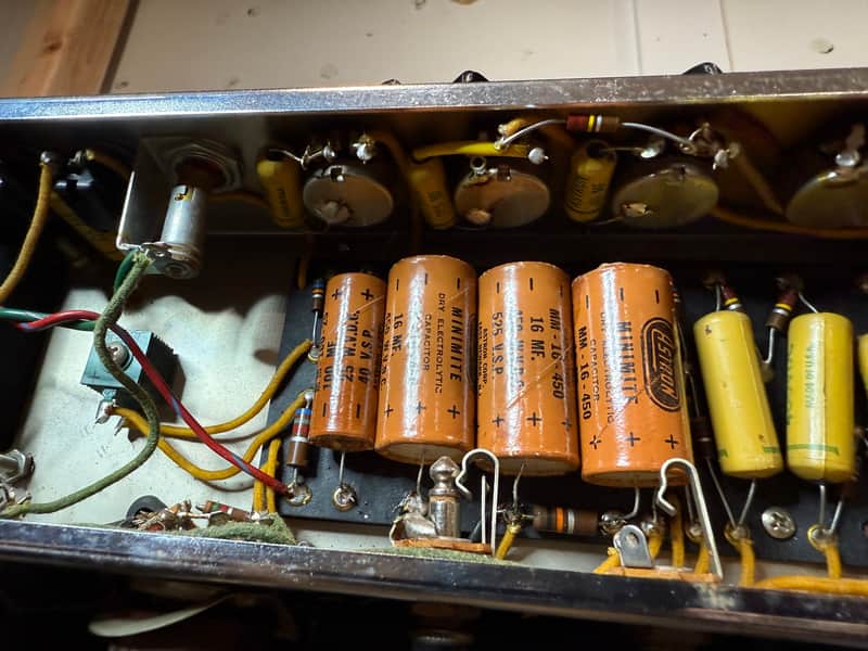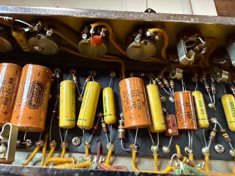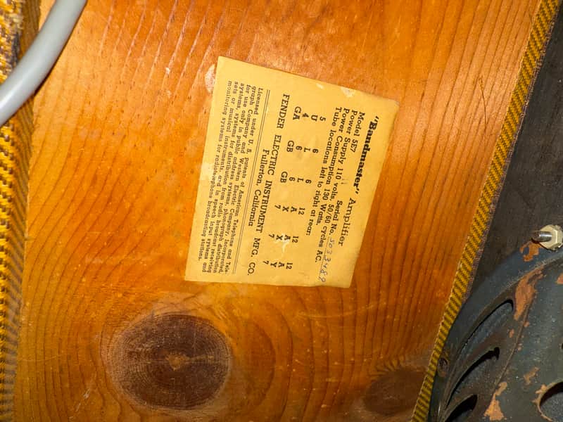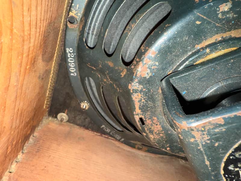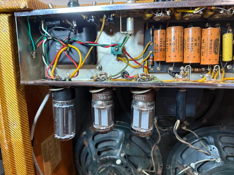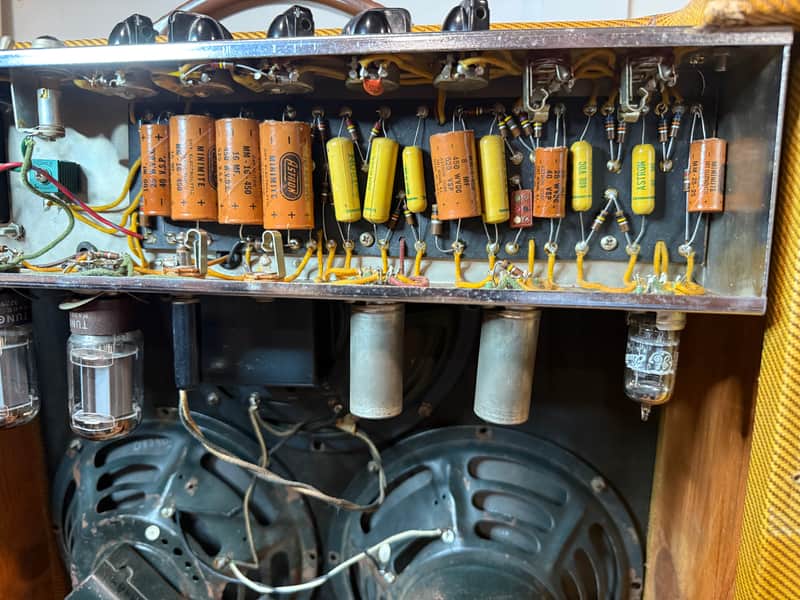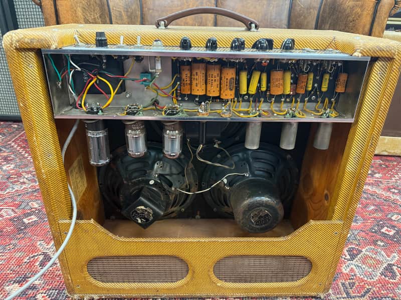 The best Fender Tweed amp and one of the holy grails of amps for sure. 26 Watts of pure bliss. This amp was bought straight from the original owners grandson. The grandfather used it sparingly. Two of the original speakers blew early in its life and were replaced (the replacements were dated early 60s). When I received the amp everything was completely original except for those two speakers (2 prong chord, caps, tubs, etc.). The original speakers weren't stored properly, but were included (this is why two of the speakers are slightly more rusty than the third). I had the two originals reconed and put back into the amp (some speaker wire is non original). The speakers date to 39th week of 58, 7th week of '59, and the 21st week of '59. The amp was also professionally serviced here including: replacing all electrolytic capacitors (inside of the original sleeves) and the 3 prong chord. All tubes remain original and perfectly matched. The transformers are completely original as well as the tweed, grill clothe, control plate and handle. It sounds absolutely amazing and has no issues.