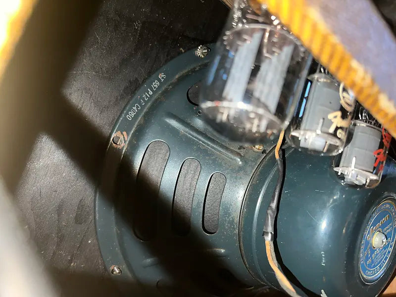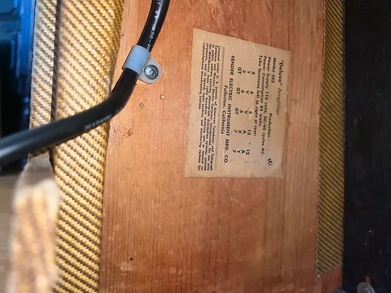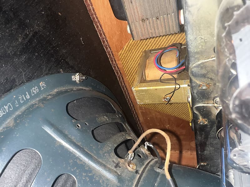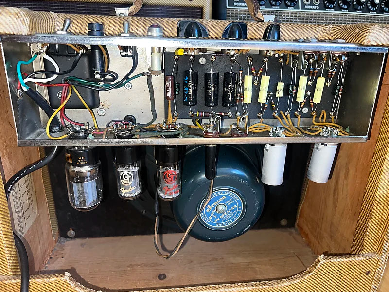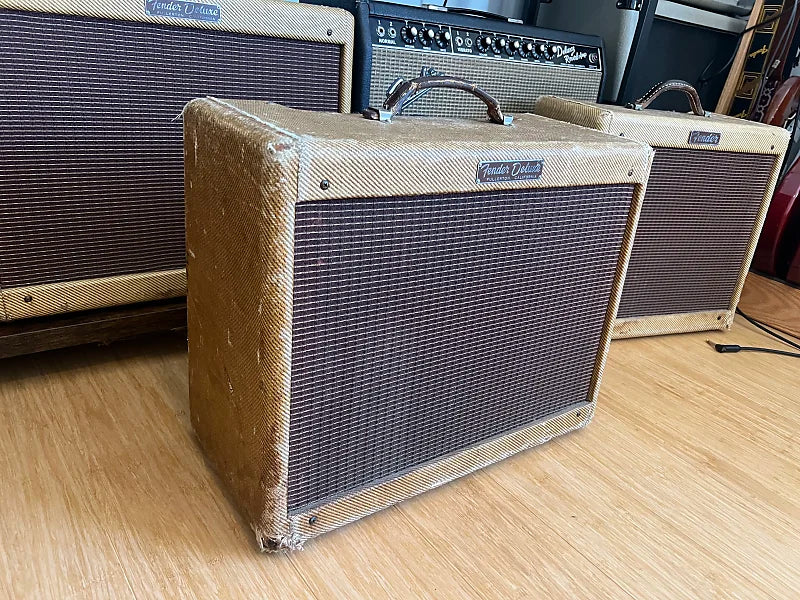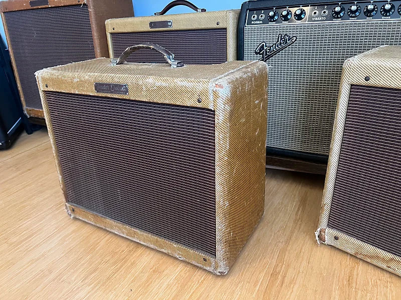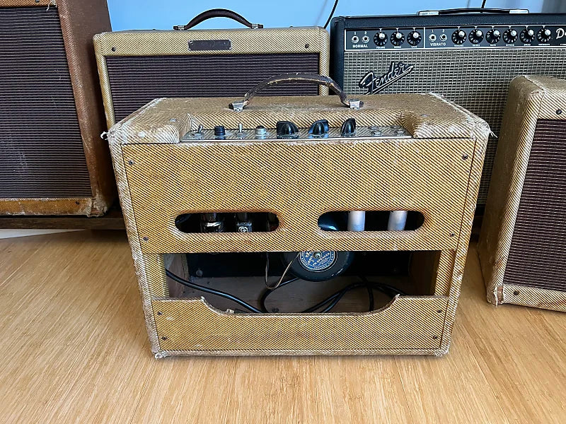 Another killer tweed deluxe. This 1959 has all the important original components (transformers, speaker, tweed). It has had typical maintenance of some caps and the three prong chord. It works and sounds great, no issues.