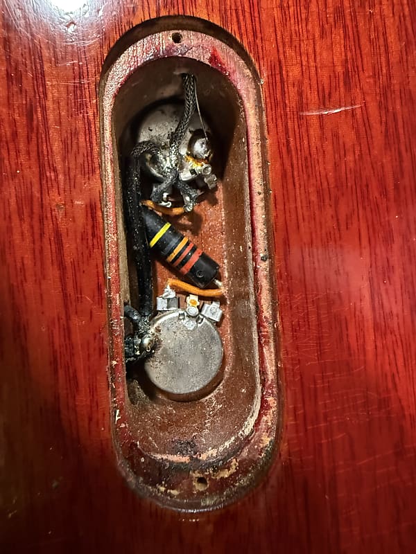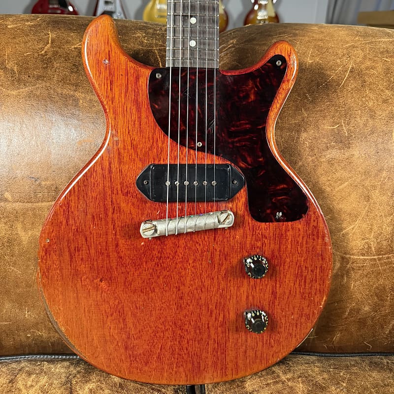 1959 Gibson Les Paul Junior, THE year for Gibsons and for good reason. This example is all original except for the frets and nut, both of which were redone perfectly. Has the classic earlier 59 chunky but comfortable neck shape. The original cherry finish shows some natural wear, especially on the back of the neck where it is worn in all of the good ways. This guitar previously had another set of tuners on it, the originals are back on. This left a few extra screw holes, two were outside of the footprint of the original tuners and have been filled and dyed (only the holes were dyed, not affecting the original paint). There were also two added strap buttons at some point around the upper horn. Again, both of the holes were filled and dyed (only the holes were dyed, not affecting the original paint). No breaks or repairs. It plays wonderfully up and down the neck and sounds great. Comes with an 80's hardshell case that will protect it perfectly.