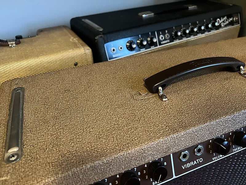 1960 Fender Pro 6G5. One of the more underrated vintage Fender amps in my opinion. The amp has all original transformers. This amp just had minor professional service performed on it which included: replacing a few filter/bypass caps, new treble pot, and one new telefunken 12AX7 tube. All of the original components are included. It is working 100% and sounding fabulous. The only real modification done to the amp was a blackface style handle installation. This left 2 extra screw holes and some slight marring of the tolex on the top. The screw holes have been covered by proper brown tolex. The correct style handle on the amp now is a replacement. The speaker cable is a replacement. This amp comes with its original Victoria cover.