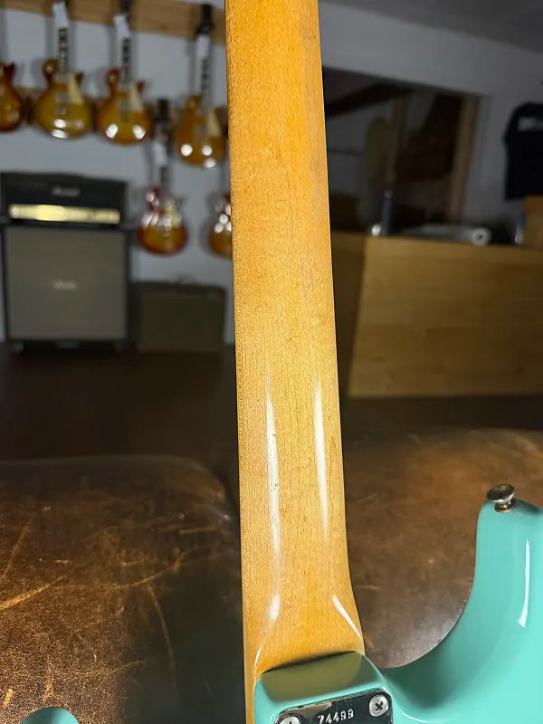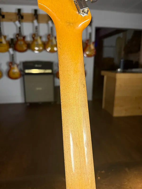 1962 Fender Stratocaster in a nicely done Daphne Blue Refinish. A great year for strats, this one is on the earlier side of the year and still sports the slab rosewood fretboard. This guitar is all original except for the bridge pickup cover, which is a genuine period correct cover that does not quite match the patina of the other two originals. The bridge and middle pickups have been rewound and releaded, but the neck still sports its original leads and winds. It had different tuners on at one time, the originals are reinstalled with conversion bushings (6 small holes at the back of the headstock have been plugged) and there is a little evidence on the front of the headstock from the previous tuners. There was also an extra string tree that was plugged. One if the tips of one tuner broke off, but the tuner still functions. The guitar was just professionally setup and plays/sounds great. We can talk about case options; I do not have the original. I do have some vintage cases and newer cases depending on pricing.
