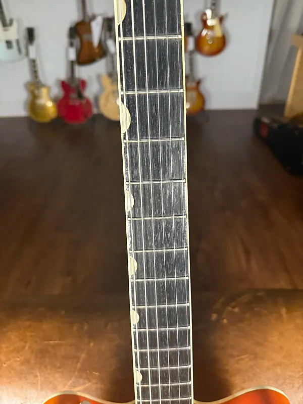 1964 Gretsch Chet Atkins 6120. This guitar is all original and in very good condition. There is some typical binding rot (mostly on the endcap), but I have seen far worse. There is some finish deterioration under the vinyl back cover, otherwise the finish is in excellent condition. The original frets are a tad low, but play just fine. Comes with the original case.