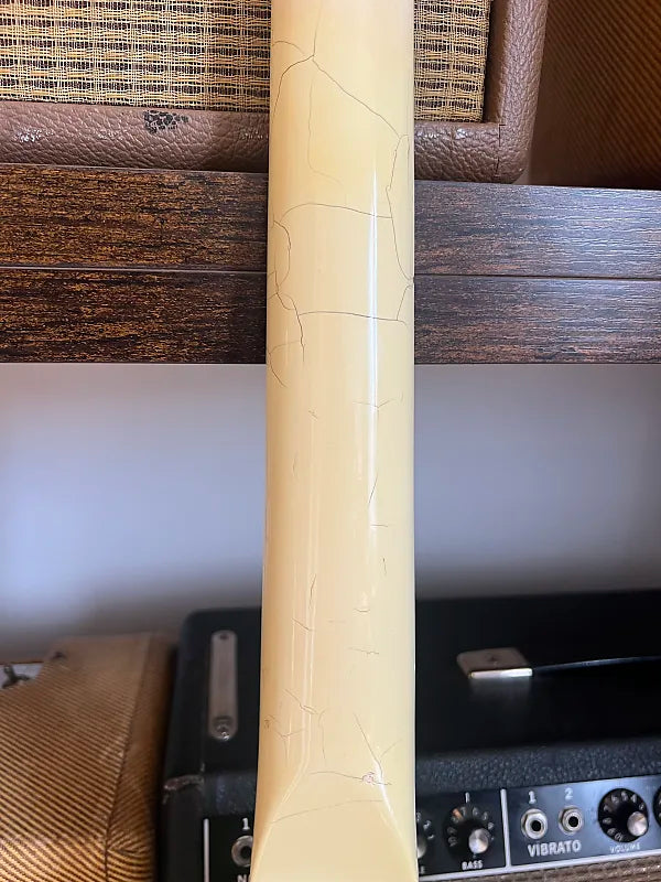 1965 Gibson Firebird III Non-Reverse. It’s been refinished in Polaris white, most likely a very long time ago based on its aging. It looks absolutely awesome. This guitar plays and sounds great. The bridge, knobs, trem system (not currently engaged), and tuners are replacements and it has an extra strap button. All three Pickups and the pots are original, but the wiring has been worked on. It’s been rewired to 3 volumes and one tone with: up position = neck and middle, middle position = all three, down position = middle and bridge. This gives you any kind of pickup combination you want (including having it act as a standard 2 pickup Gibson by just putting the middle pickup volume to 0). There is probably a neck break, but it’s difficult to see as it’s been painted over. It’s priced that way anyway. She is rock solid now and ready to go. The cracks currently shown on the neck, heel and headstock are all just finish cracks, not structural. The frets are a tad low/wide, but it still plays well including bends. Comes with a nice Gibson padded gigbag (not your average gig bag.