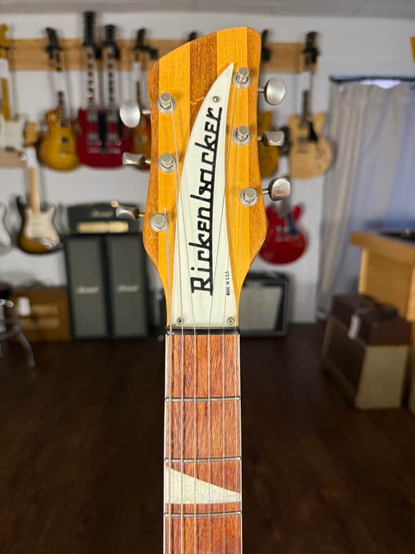 1967 Rickenbacker 365 in Mapleglo. This guitar is in excellent condition. Just pro setup, it plays and sounds great. It is 100% original with except to 1 mod. Rick purist may not love it, but a player most likely will. It was refretted and the finish was removed from the fretboard. I personally love how it feels now. Finish is in excellent shape with one small area of wear on back of neck. Comes with a non original newer grey rickenbacker hard case.