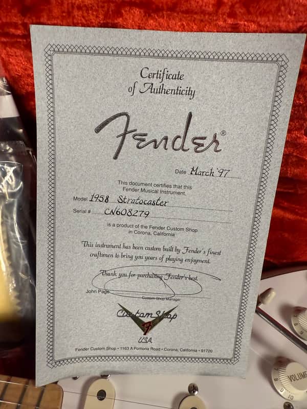 1997 Fender Custom Shop 1958 Stratocaster with Birdseye neck. This guitar is 100% original and near mint condition. There are two small indentations in the finish on the body (see photos). It has stock shielding paint in the pickup cavities (I have seen others from this era with this). Just pro setup, its playing and sounding great. Comes with the original tweed case and all paperwork/accessories.