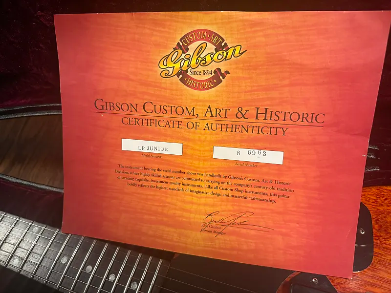 2006 Gibson Custom Shop '58 Reissue Les Paul Junior. This guitar was owned/toured by Brian Baker of Bad Religion/Minor Threat. He used this guitar on a European tour with Bad Religion. Some modifications were made to make it tour ready: moved strap button, compensated bridge, and likely a replaced pickup (I'm not exactly sure what it is original or not, but I have included a photo of the bottom). The guitar was recently traded to me by Brian. It plays and sounds great after a recent pro setup. No breaks or repairs. Comes with the original hard case and COA.