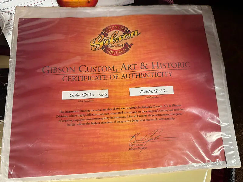 2007 Gibson Custom SG Standard in Alpine White VOS. This guitar is 100% original and near mint aside from the one ding on the side (still has the plastic on the guard). It plays amazing after its recent pro setup. Big neck on it. Comes with the original case and all paperwork/COA.