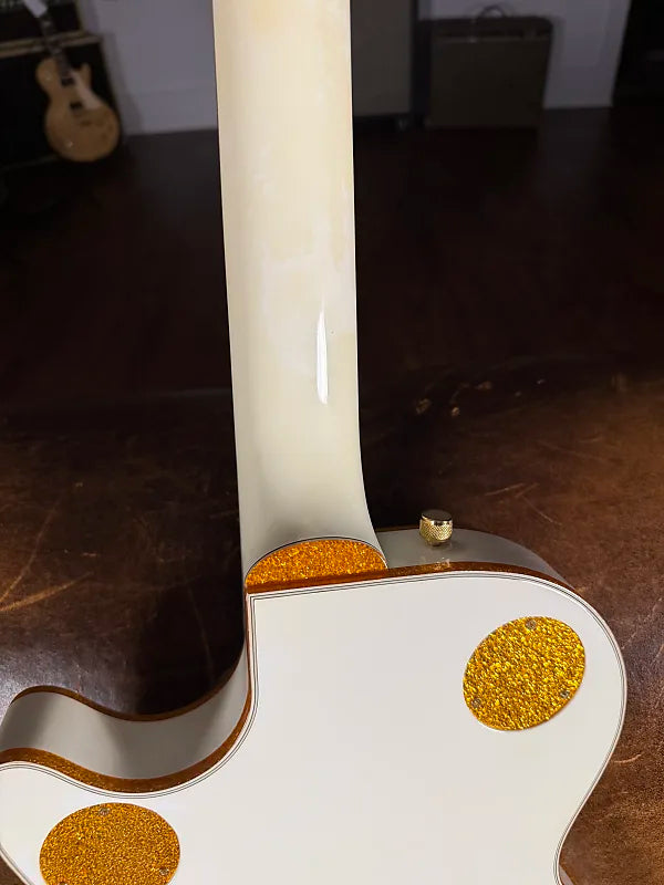 2011 Gretsch White Penguin, Made in Japan. This is an excellent all original example. It was just professionally setup and plays/sounds great. Minor finish discoloration in some areas (mostly on back of neck), its aging naturally and starting to look like a real old Gretsch. There is a minor bump on the back of the neck (probably from a capo). Frets are in excellent shape. Comes with the original hard case and truss rod tool.