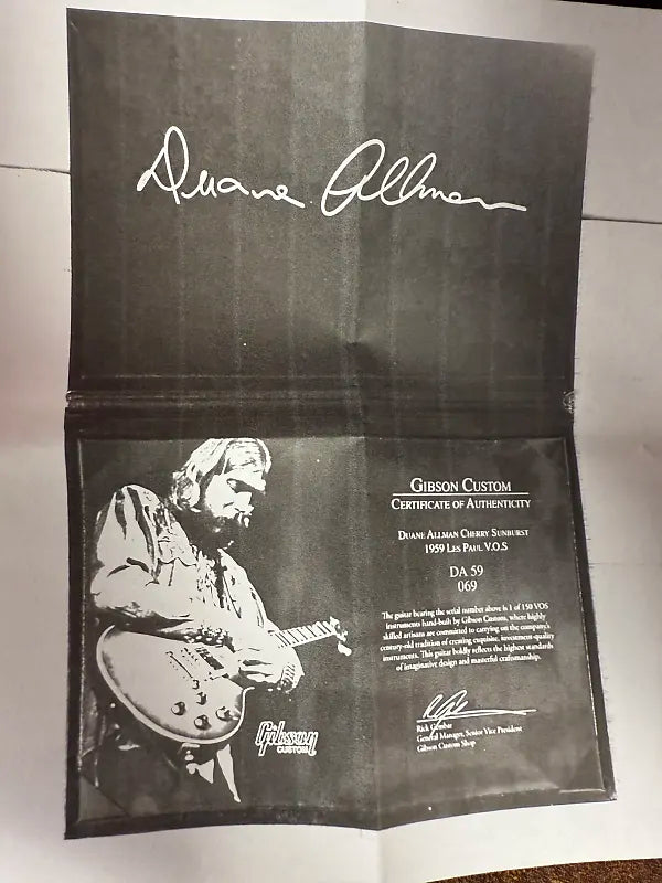 Gibson Custom Shop Duane Allman '59 Les Paul #69 (happens to also be the year the band was formed). This guitar is a reissue of the Les Paul that Duane Allman used to play with the Allman Brothers band during the 1970s on the live album "At Fillmore East", and "Eat a Peach" live. Made with '59 specs, it includes a pair of Gibson's custom bucker PAF pickups, and is finished in a lemon burst VOS finish. Other specifications include no pickup covers or pickguard much like Duane's, and replaced machine heads like his original.