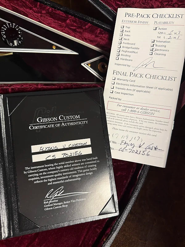2017 Gibson Custom Shop Flying V Custom. This was a limited run from 2017 and is basically Les Paul Custom appointments on a Flying V. The guitar is in excellent shape and is 100% original. Just pro setup, plays great. Comes with the original case and all paperwork. Also have the matching Explorer for sale.