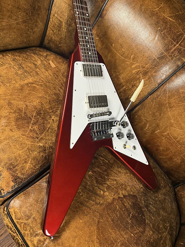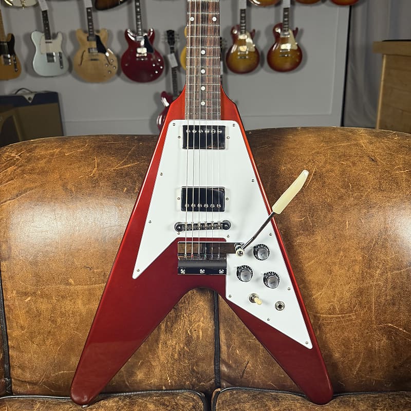 2021 Gibson Custom Shop '67 Mahogany Flying V in amazing sparkling burgundy finish. This guitar is a killer, lightweight and plays great. Recently pro setup. It is in excellent shape, with the only modification being the strap locks (original strap buttons are in the case). Comes with the original case and all the paperwork and COA.