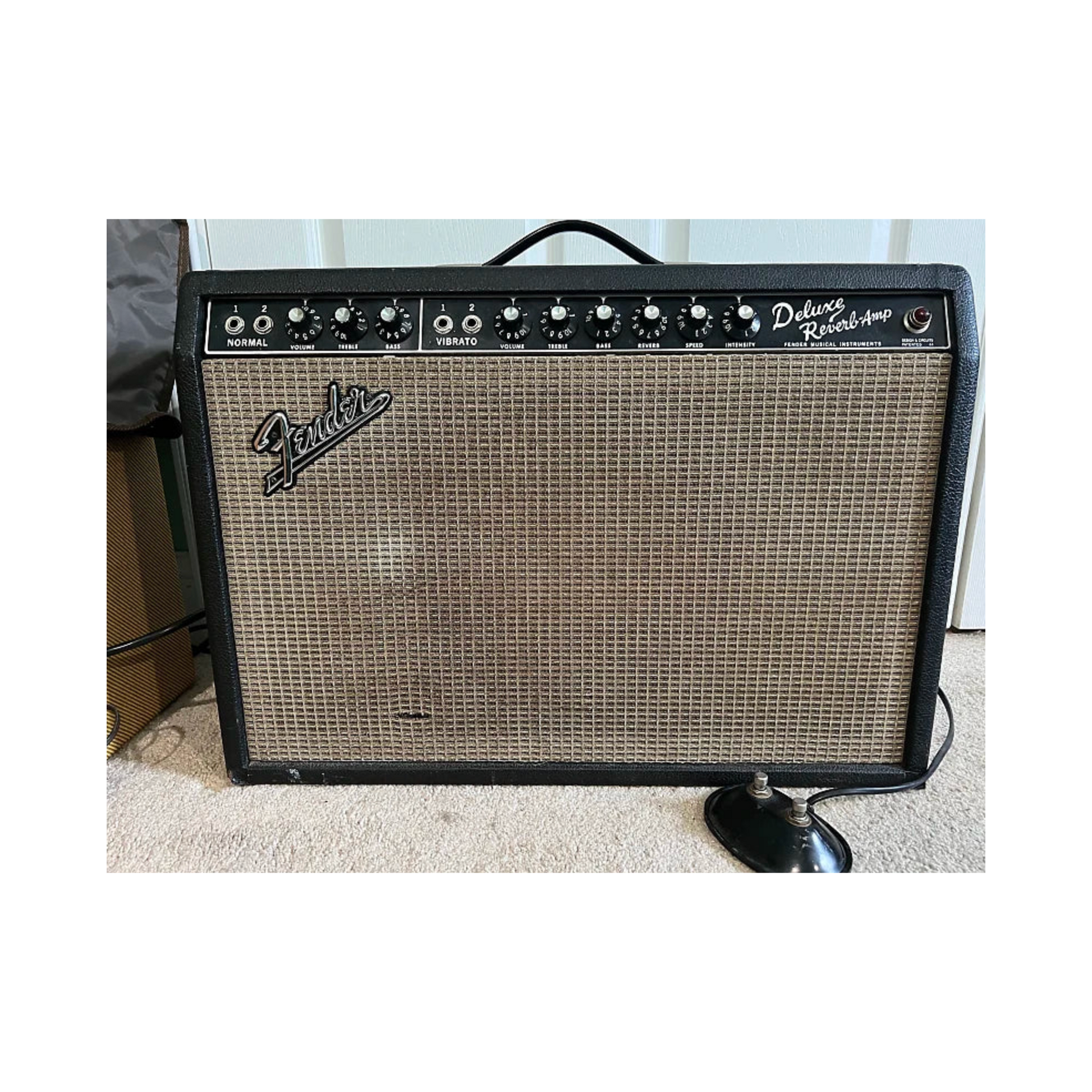 Almost entirely original 1965 Fender Deluxe Reverb with original footswitch. Theres a reason they've been reissuing this model ever since reissues started. Transformers, speaker, and most of the caps are original. A few of the electrolytic caps are replaced but all the important Astons are there. The chord has been changed to a three prong and the power tubes are replaced. Few small rips in the tolex at the corners and one in the grill cloth.