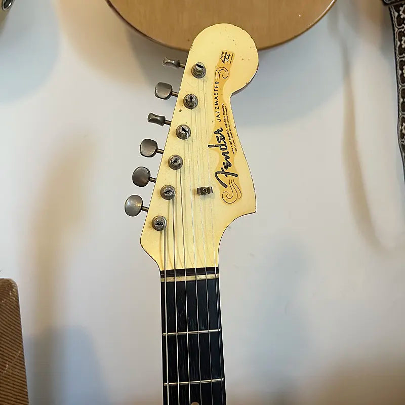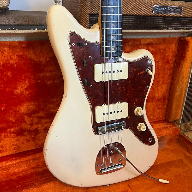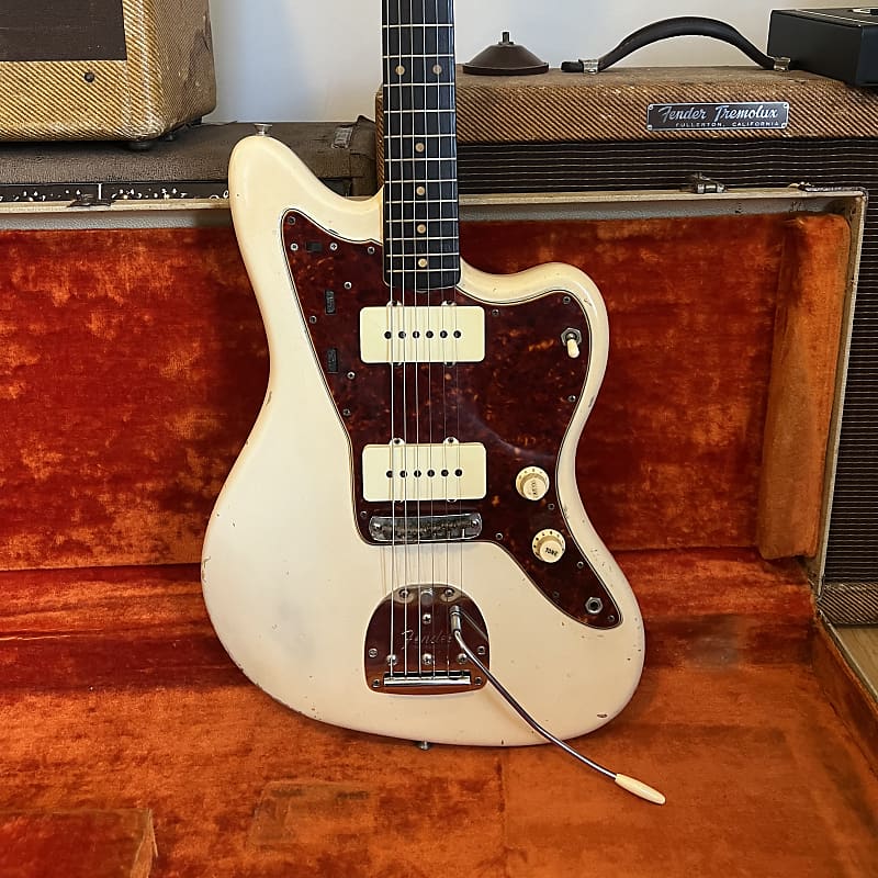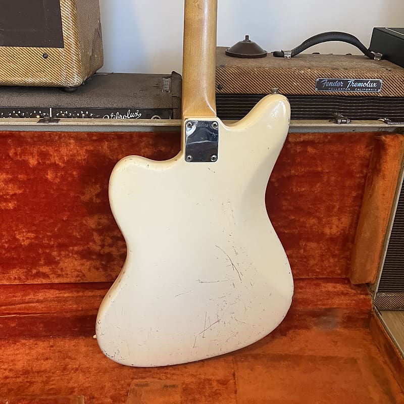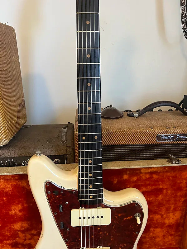 1963 Fender Jazzmaster in its original custom color Olympic White finish with matching headstock. This one checks all the boxes for jazzmaster lovers: Clay dots, black bottom pickups, custom color and blonde case. This guitar is 100% original with the exception of the two dark circuit switch screws and a few of the grounding joints on the shields have been touched up. It plays great up and down the neck and sounds wonderful.