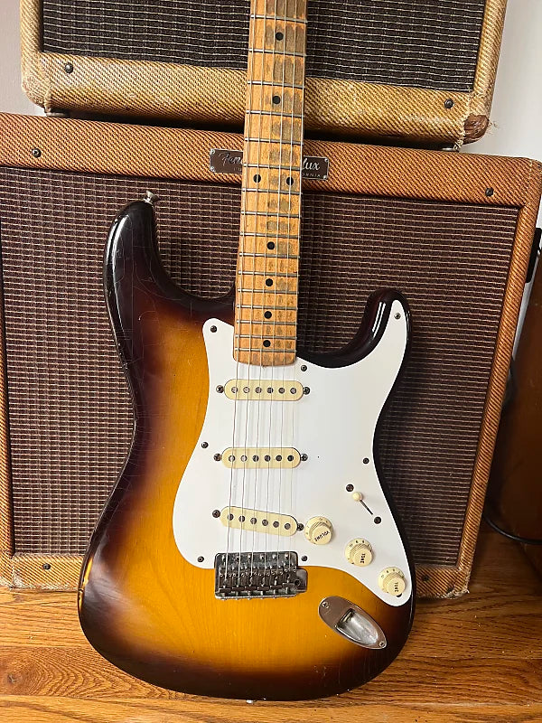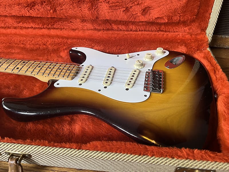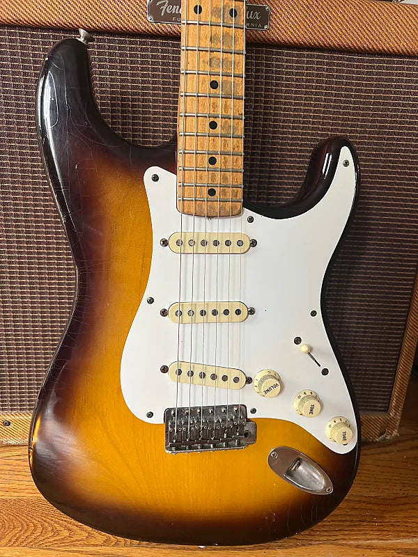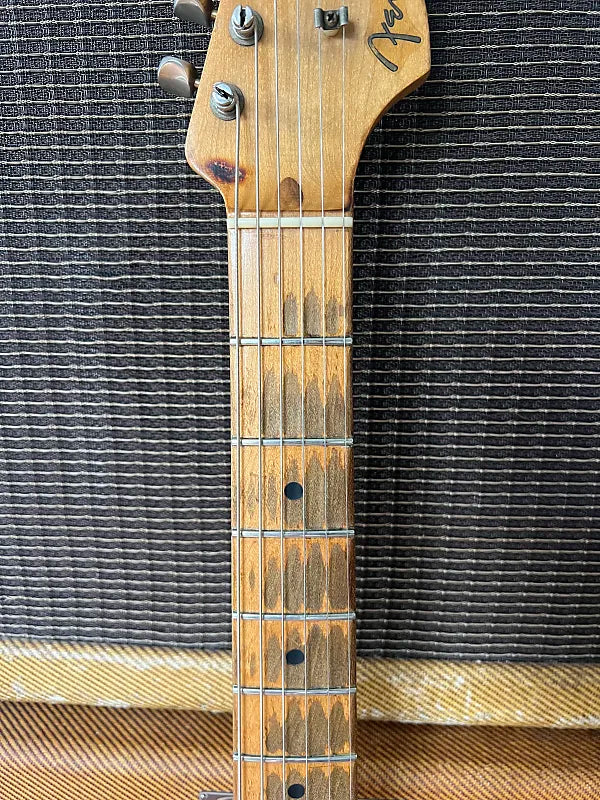 1957 Fender Stratocaster. Had only the body expertly refinished in its original 2 tone sunburst by Joe Riggio. The neck has all original finish (as does the neck pocket). All else is original except the volume pot, 5 way switch, and the tremolo springs. I do no have the backplate or tremolo arm. It has also been refretted with jumbo frets, making this one particularly easy to play.